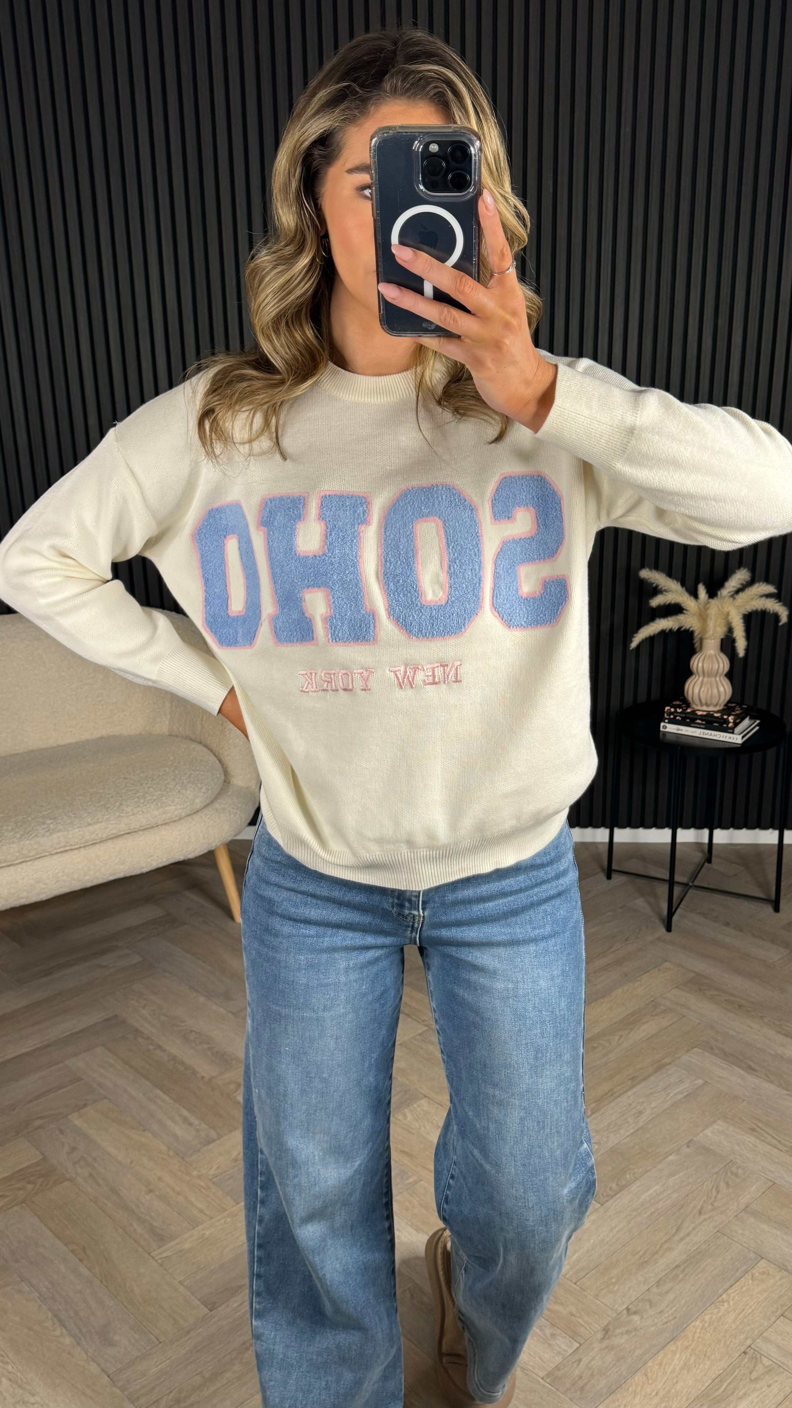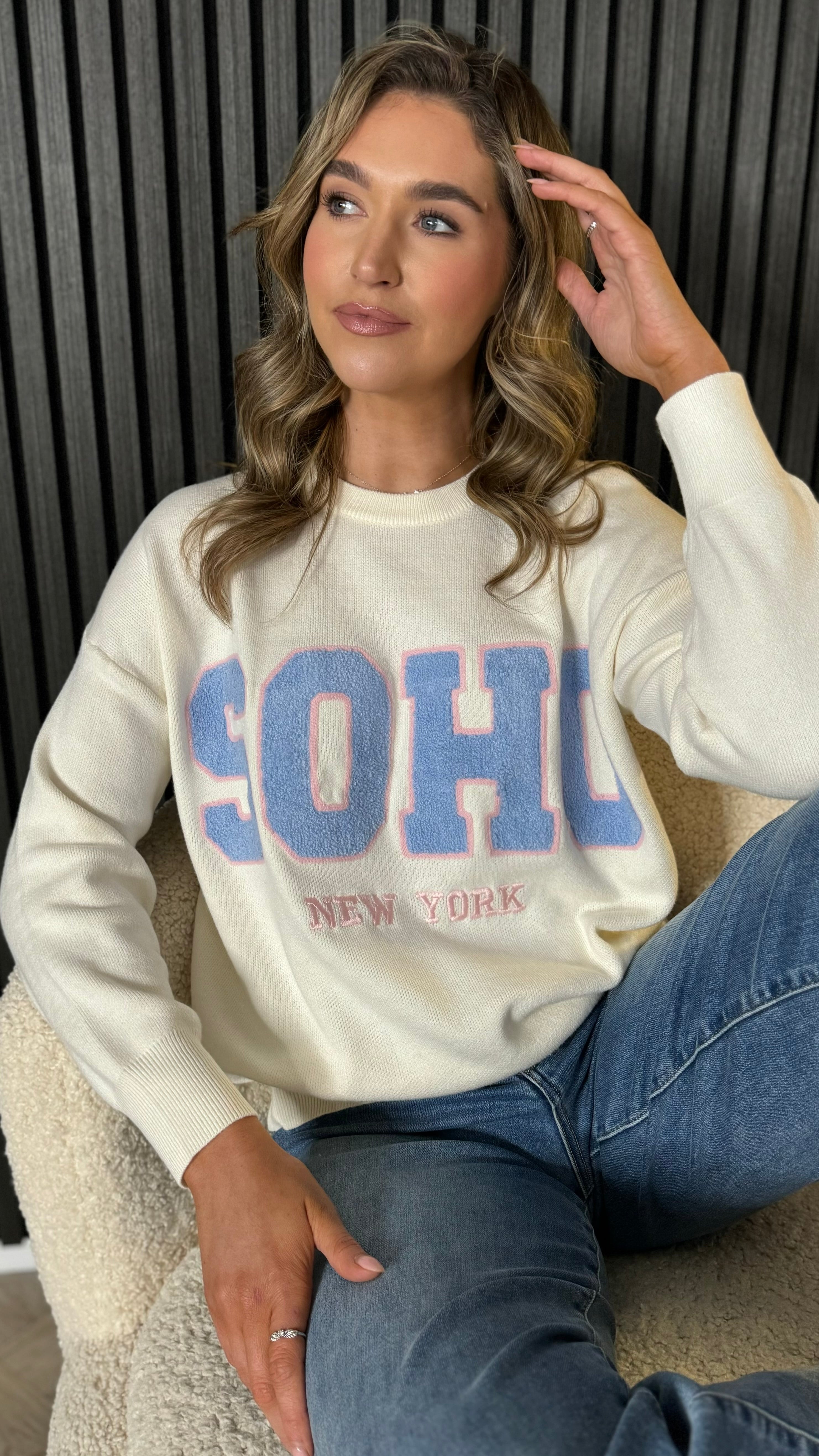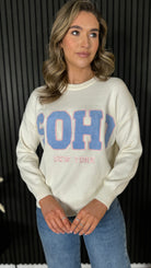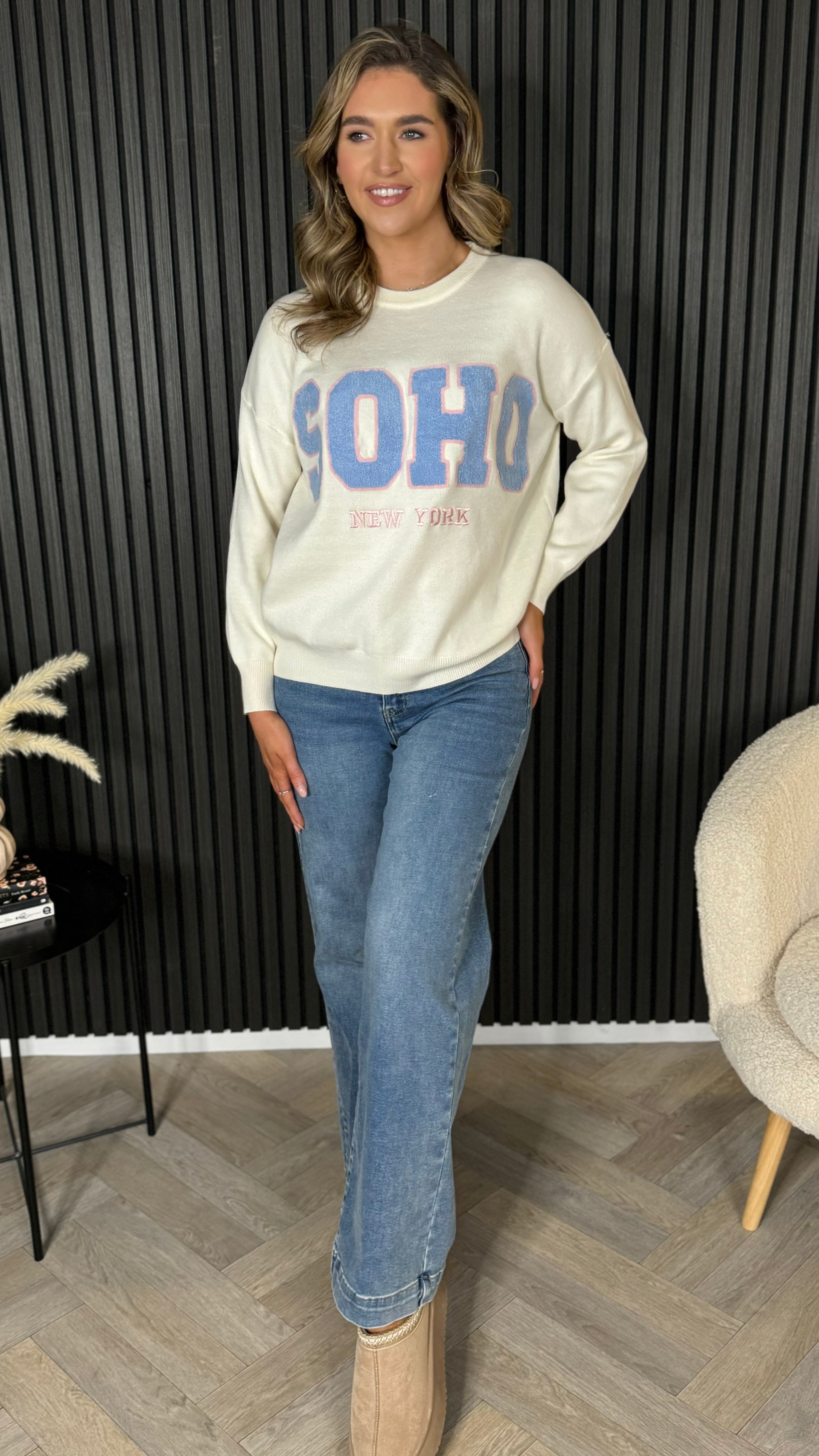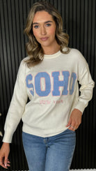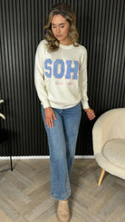 Wrap yourself in comfort with this charming cream and blue jumper, featuring a textured slogan detail that adds personality to your everyday look. The soft, cosy fabric feels like a warm hug, perfect for layering or wearing solo. With its classic round neck and printed 'SOHO' design, it's the kind of piece that effortlessly elevates your casual wardrobe.