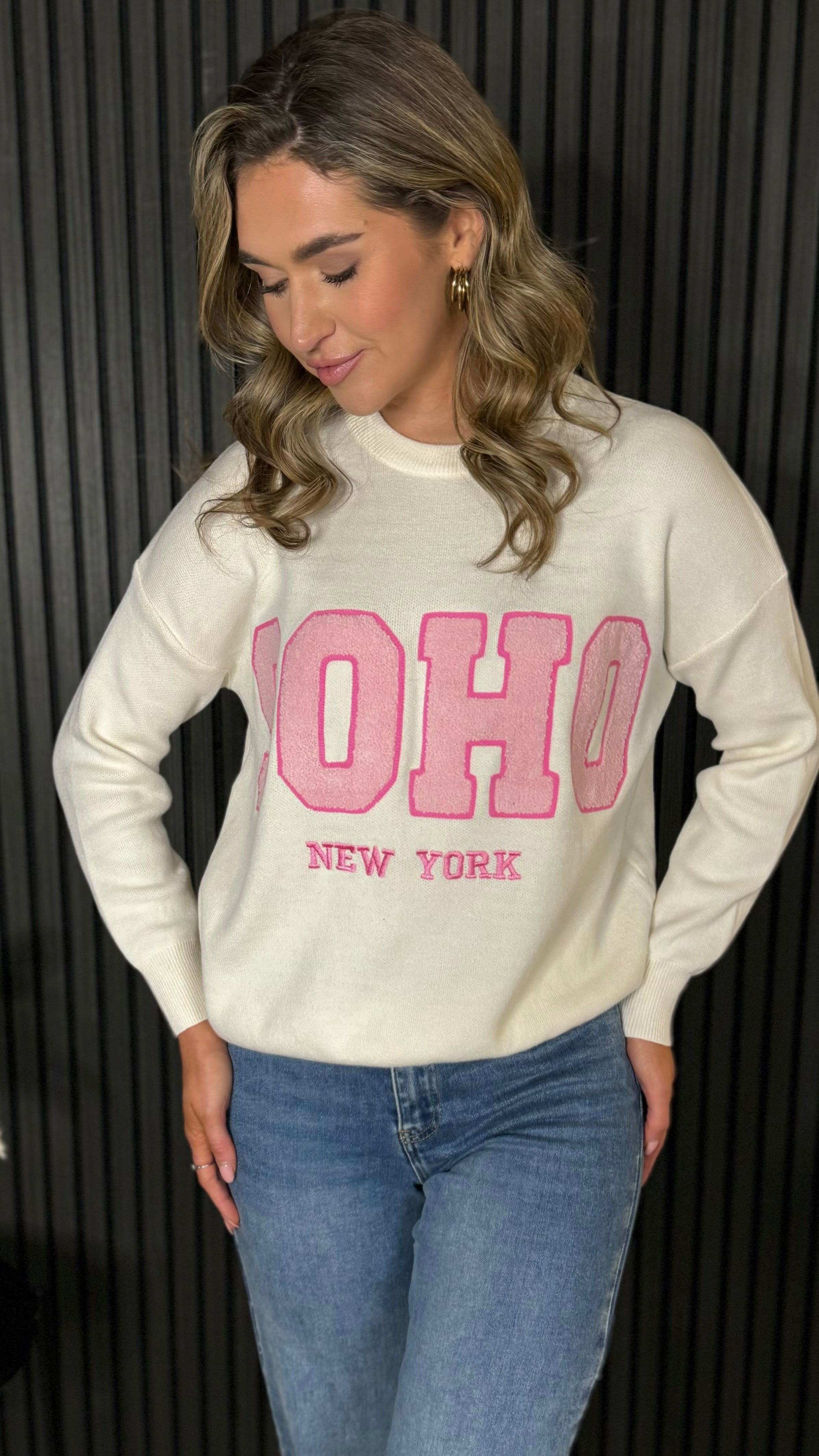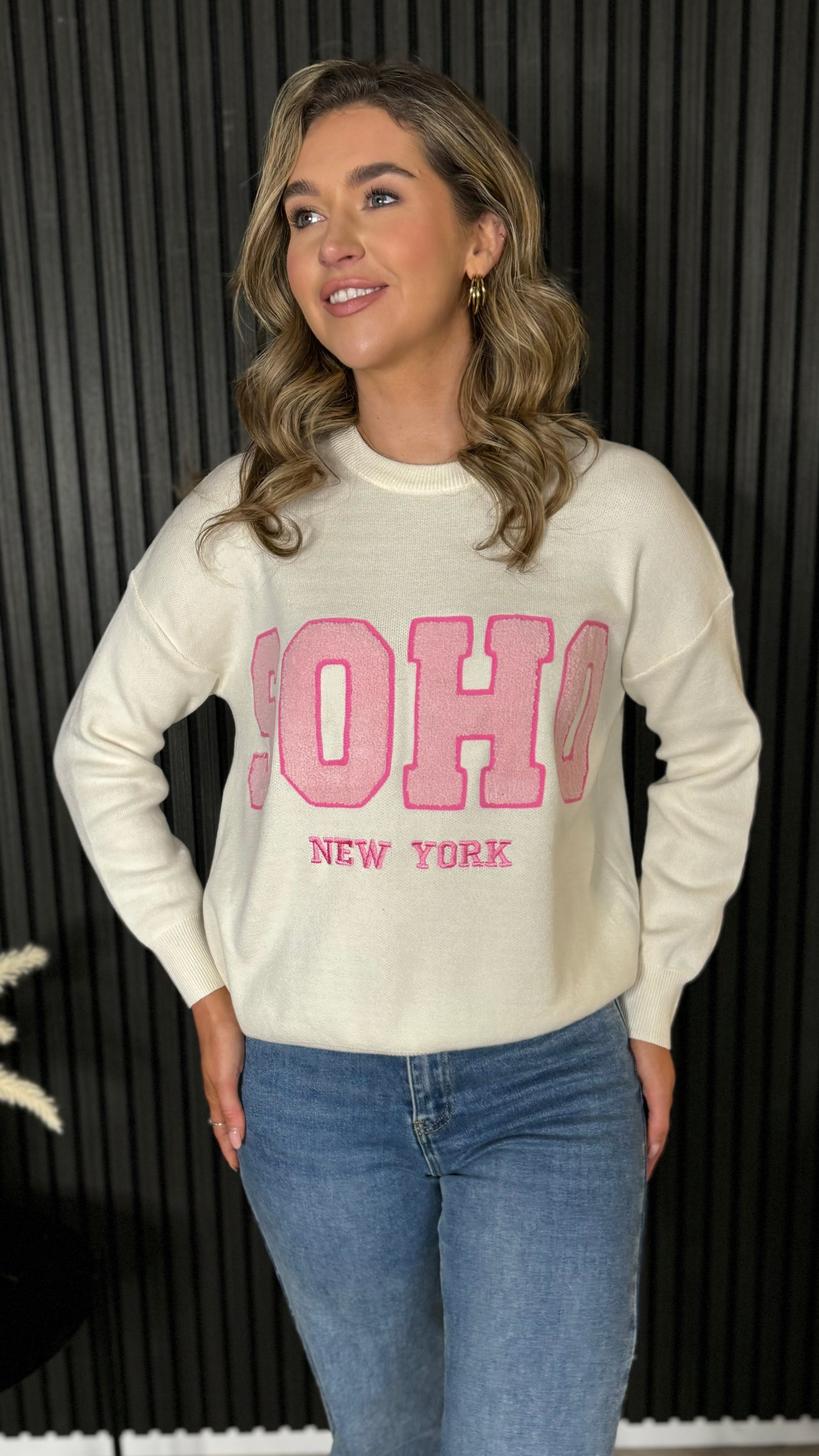 Wrap yourself in comfort with this charming cream and pink jumper, featuring a textured slogan detail that adds personality to your everyday look. The soft, cosy fabric feels like a warm hug, perfect for layering or wearing solo. With its classic round neck and printed 'SOHO' design, it's the kind of piece that effortlessly elevates your casual wardrobe.