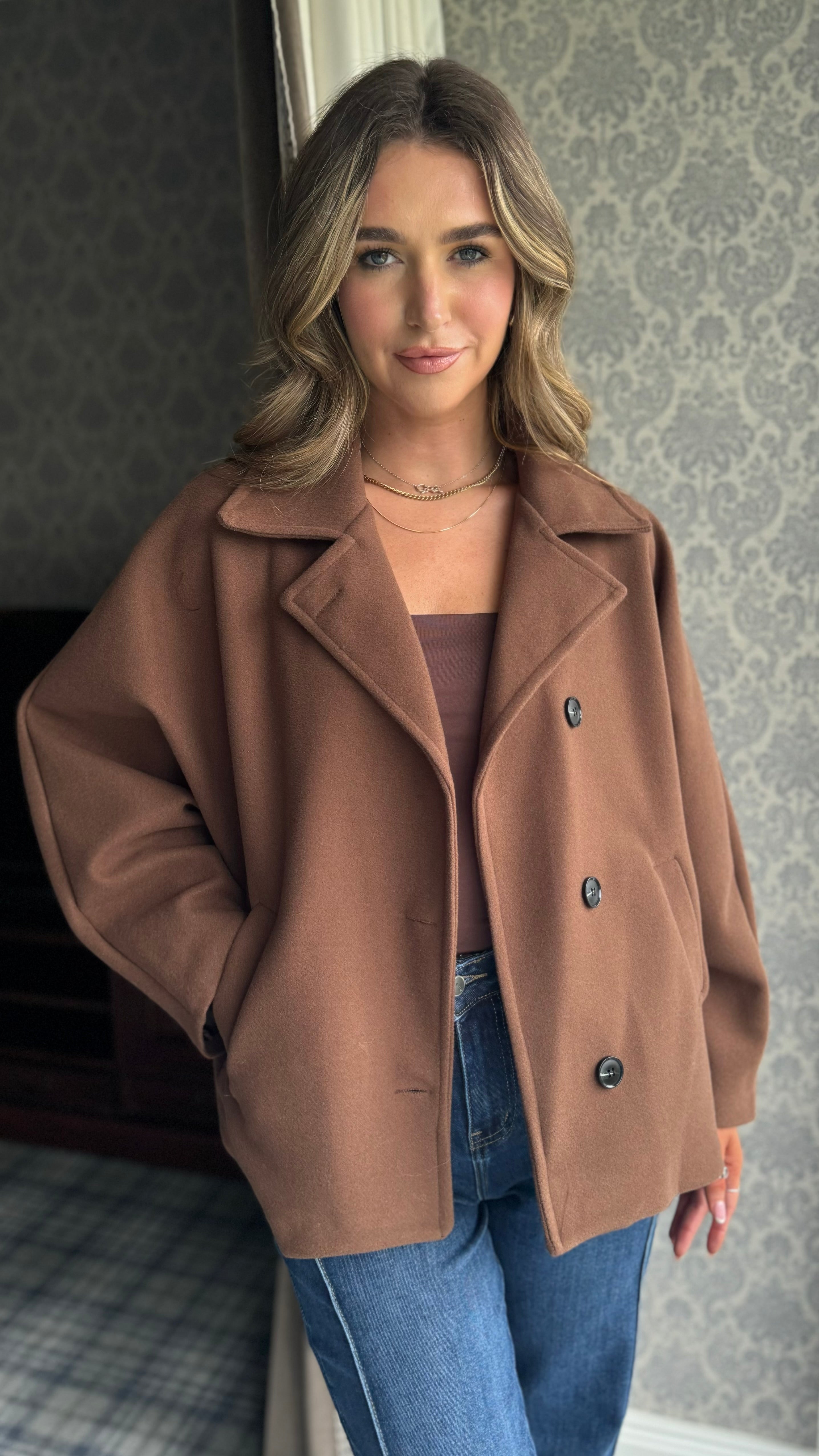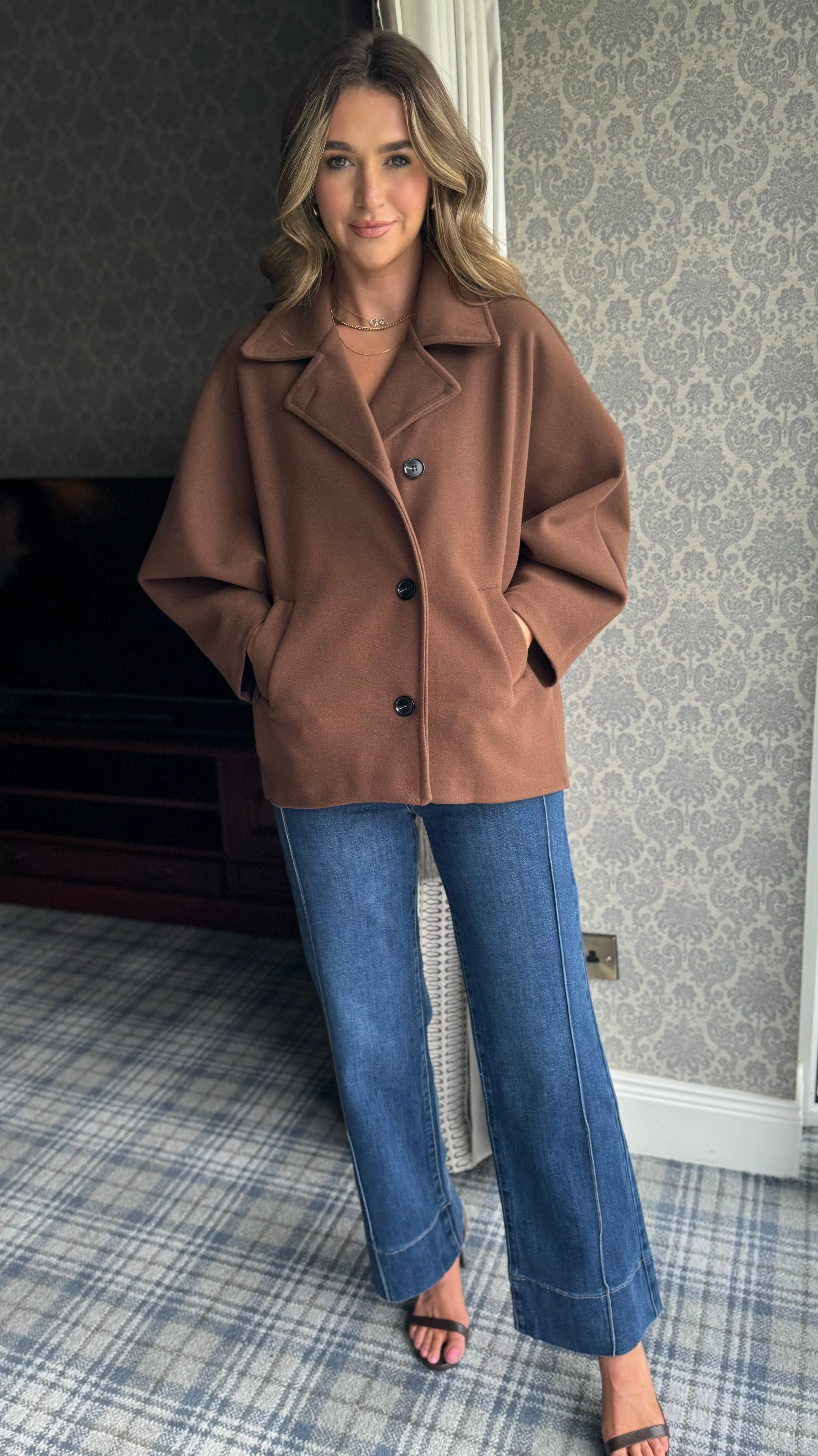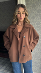 Step out in style with the Virginia Brown Oversized Short Coat, featuring bold black button details that add a striking touch. Its roomy oversized fit and pockets promise comfort with a cheeky twist, while the unique collar detail brings a playful edge to your look. Perfect for layering and making a statement wherever you go!