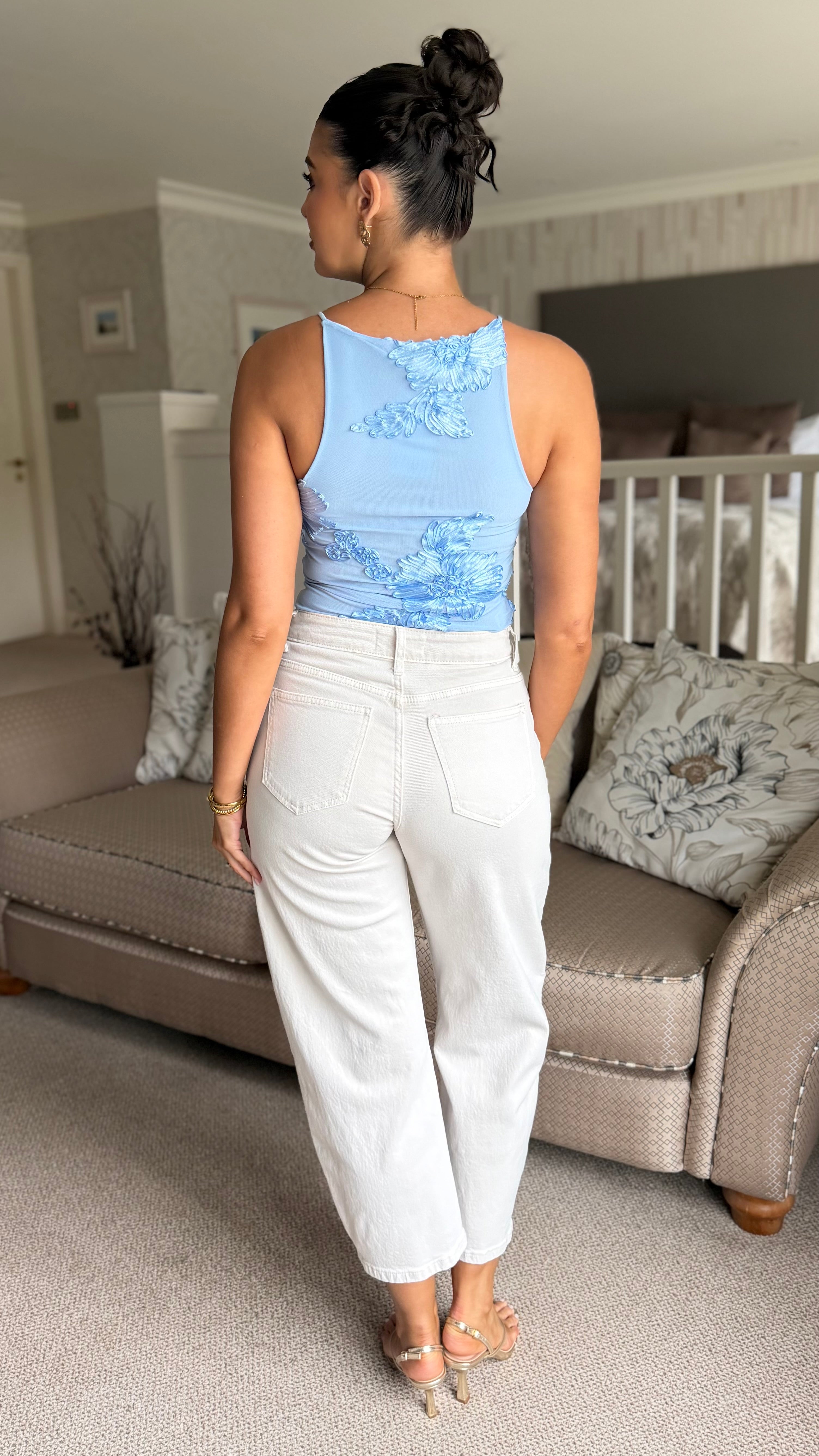 Elevate your wardrobe with this stunning Viva Blue Floral Embossed Top. Featuring delicate spaghetti straps and a flattering halter neckline, this sleeveless design offers a chic, modern silhouette. The sheer mesh fabric adds an ethereal touch while showcasing the intricate floral embossing throughout. Perfect for layering or wearing solo, this versatile piece transitions effortlessly from day to night. The breathable mesh construction keeps you comfortable while the bold blue hue makes a statement. Ideal for those seeking a blend of elegance and contemporary style.
