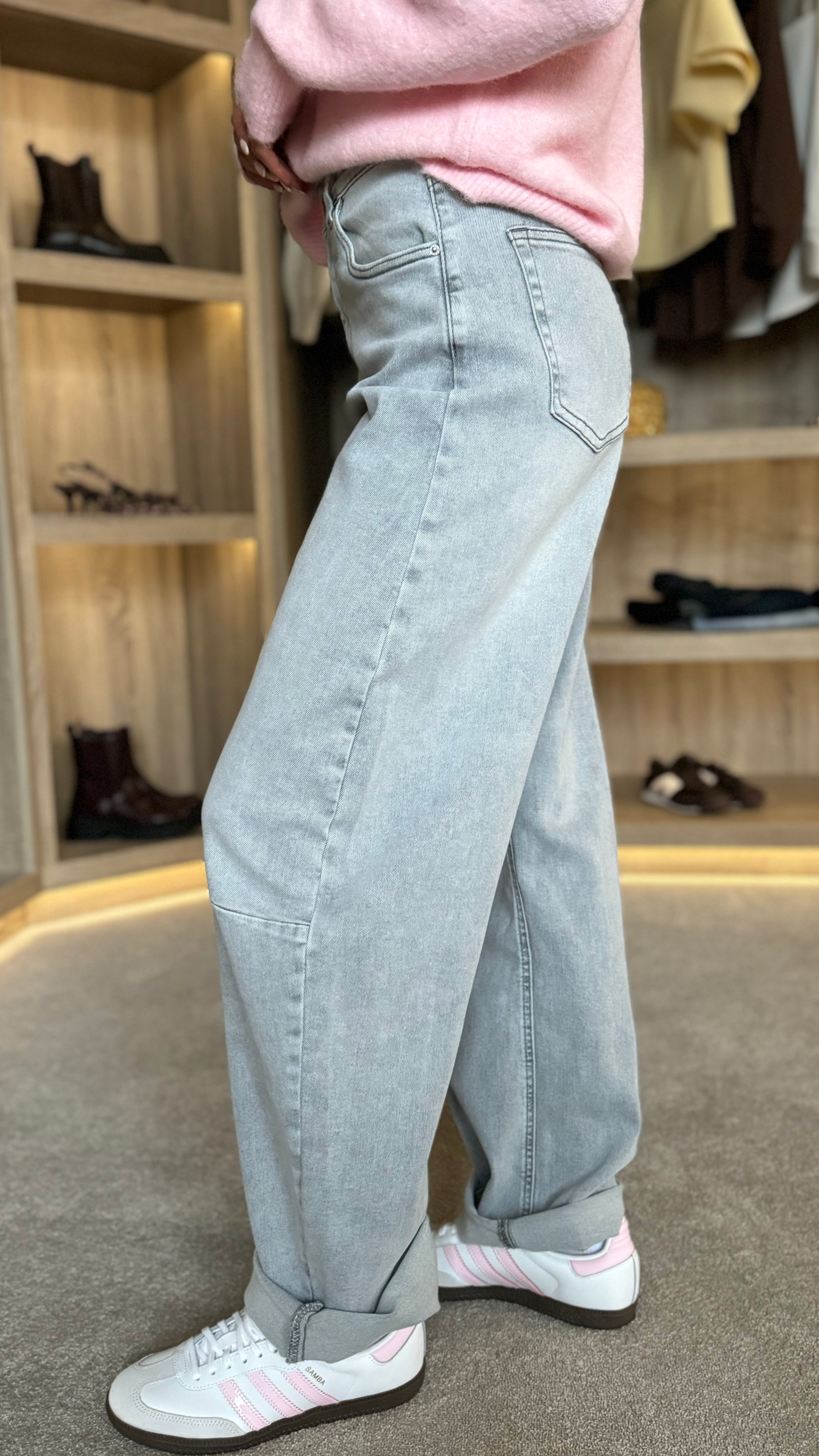 Zayla Light Grey Barrel Jeans Meet your new go-to pair. These barrel jeans arrive in a soft, faded light grey that plays beautifully with everything in your wardrobe. The relaxed barrel silhouette skims through the hips and thighs before tapering gently at the ankle—comfort that actually looks intentional. Functional belt loops keep things secure, while front and back pockets give you room for the essentials. Effortless, versatile, and ready for whatever comes next.