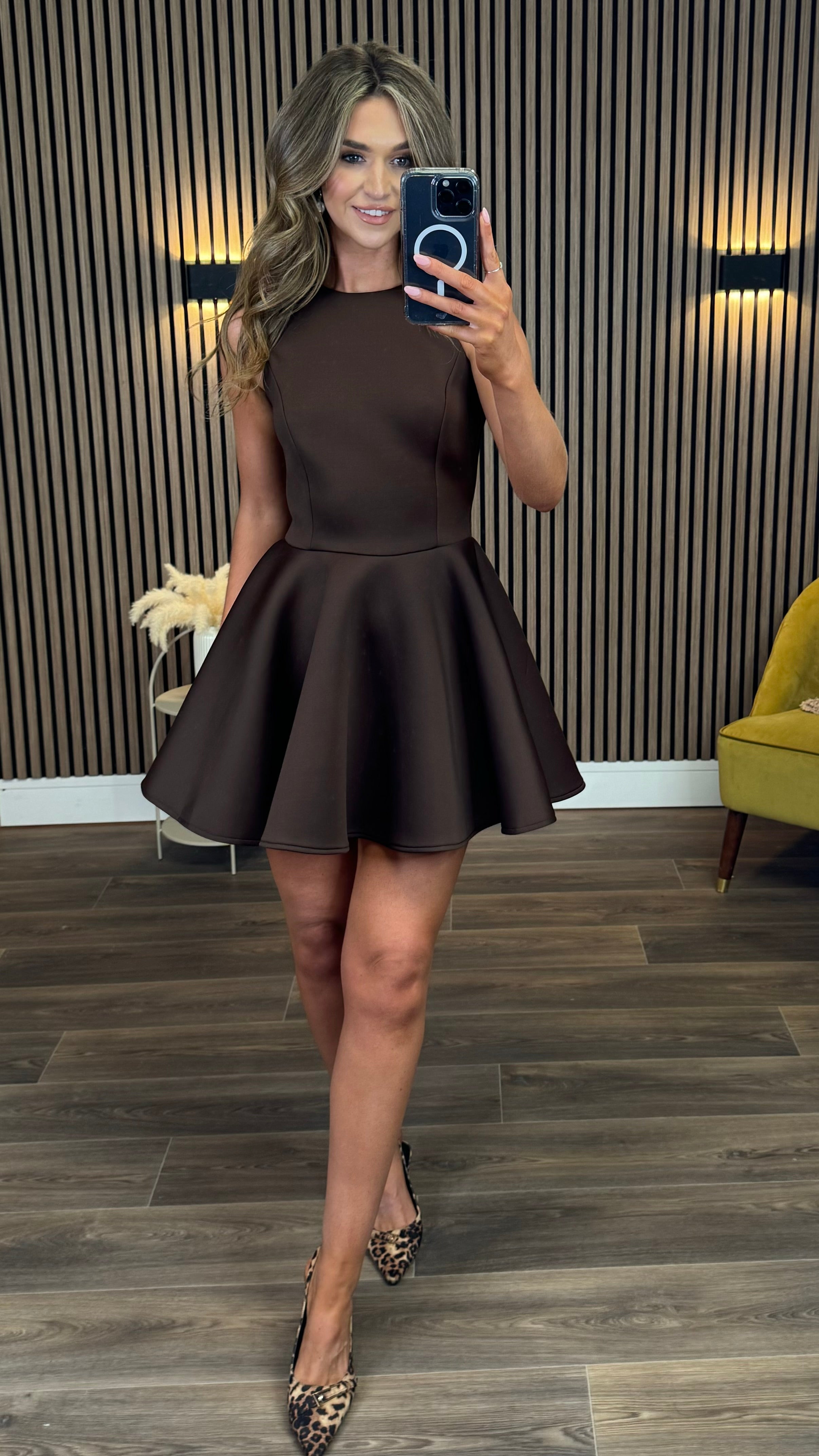 Zayna Chocolate Racer Neck Scuba Skater Mini Dress